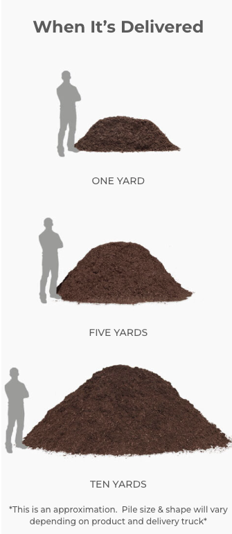 One cubic yard of mulch is a pile approximately 3 feet long, 3 feet wide, and 3 feet high (3’ x 3’ x 3’).